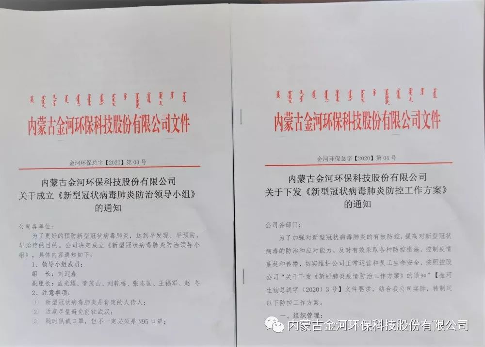 亥子更替,新元伊始,突如其来的一场新型冠状病毒肺炎疫情席卷中国大地。 金河环保公司高度重视,迅速反应,按照地方政府和上级单位有关要求,成立专项工作组织机构,压实各级领导责任和防控责任,按照属地管理原则,落实早发现、早报告、早隔离、早治疗和集中救治措施,建立疫情防控工作群,每日汇总并向上级汇报防控疫情工作开展情况。各部门、分厂安排专人上报本单位当日疫情防控情况。同时,公司通过内部微信群、QQ群、等途径向各部门、分厂职工开展正面宣传,普及疫情防控知识和防控要求,引导职工正确认识疫情,科学做好防护措施,全面确保安全生产稳定,职工队伍稳定。