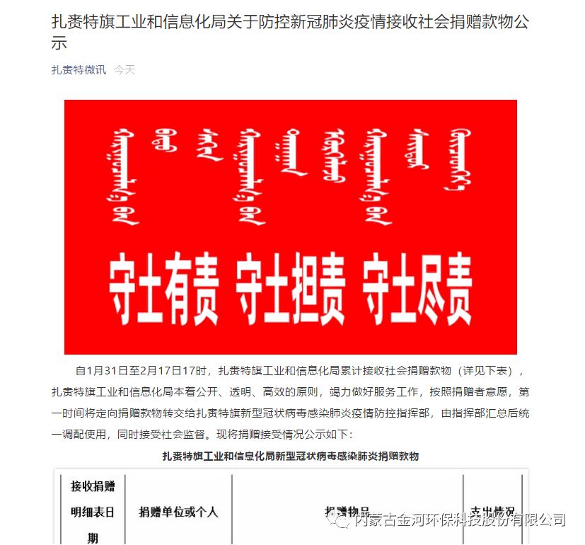 众志成城,并肩战疫。疫情爆发以来,金河环保公司主动承担社会责任,以实际行动助力疫情防控。2月初,公司向托县人民政府捐赠伍万元现金用于抗战疫情。